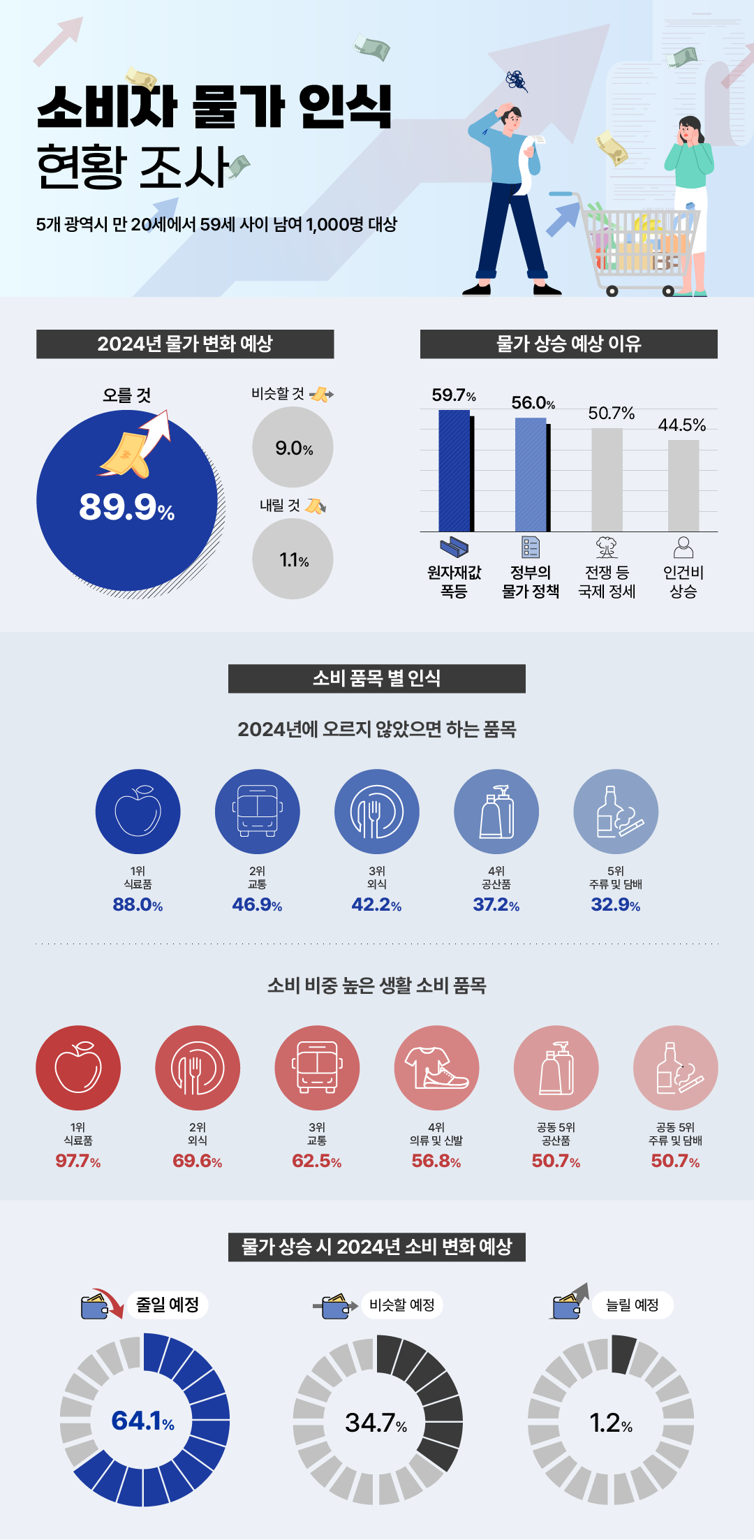 소비 품목 별 인식 조사 결과, 소비 비중이 높은 생활 소비 품목(5개 중복 선택)으로는 1위 식료품(97.7%), 2위 외식(69.6%), 3위 교통(62.5%)이 꼽혔으며, 2024년에 오르지 않았으면 하는 품목 또한 같은 항목으로 1위 식료품(88.0%), 2위 교통(46.9%), 3위 외식(42.2%), 4위 공산품(37.2%), 5위 주류 및 담배(32.9%)가 차지해 소비자들은 2024년 생활 필수품의 물가 상승을 우려하고 있는 것으로 나타났다.